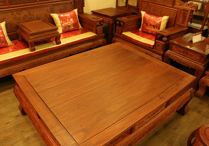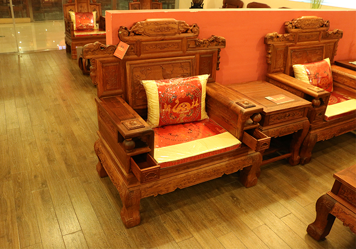 該款沙發所用材質亦是福林堂紅木使用最多的大果紫檀,也叫緬甸花梨,屬花梨木類。緬甸花梨的木紋清晰,結構細而勻,有些部位有明顯的虎皮紋,斷斷續續很是美觀;顏色偏紅色,其木紋為淡紅色,整體看上去有點肉色;緬甸花梨自身帶有一種特別的檀香味,其香悠遠醇厚,不張揚;其材質硬重,密度高。