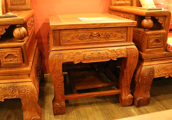 之后,我們再來看看沙發的細節:雕刻紋樣。單人沙發背板后刻有一大圓形“福”字樣的圖案,有福祿雙全、福星高照之意;在沙發正上方刻有一帶“發”字的花紋,寓有大吉大利、財源亨特之意;沙發正背板處刻有樹杈、枝葉以及小鳥,頗顯生氣與活力,帶有春意濃濃、朝氣蓬勃之寓意;沙發靠手兩側帶有一可以轉動的滾珠,在其下方則有一可以推入拉出的小屜,多以裝飾之用。我們再來看看與之沙發配套的高幾,高幾上方抽屜拉環處刻有一十分立體飽滿之元寶圖案,彰顯著財運滾滾系列沙發的初始寓意,其下方鑲嵌刻有一古時候人們常佩戴之金鎖圖案花紋,并串有幾圈環形銅錢,而兩側則分別帶有兩只金雞圖案的刻紋遙頭相對,昭示著金雞破曉,財源廣進之意,十分形象生動。在其幾腿上則配以祥云花紋環繞相倚,給人一渾渾一體、流暢行云之感。其他兩只,雙人長沙發以及臺幾其中花紋也多以其類似相間,鑒于筆者文字水平以及無實物接觸的原因,有些細節之處可能并未在此提及,不過這一系列之沙發總體以賦含了“財源滾滾”“財運亨特”“大吉大利”之意,配之以古樸的木雕工藝以及中國文化之豐富內涵與底蘊,給人以一股極為濃郁的東方家具之氣息,美麗沉淀。
