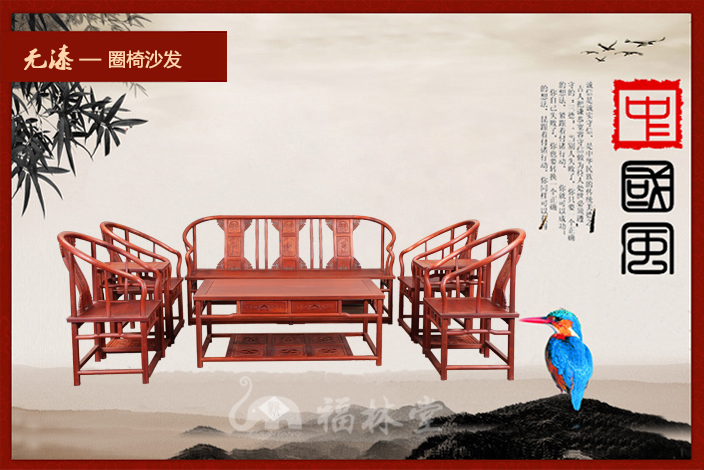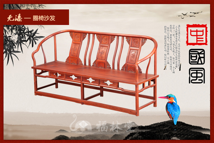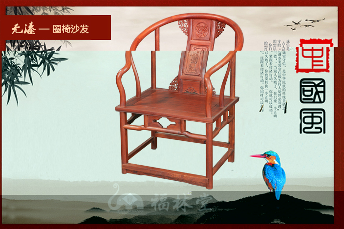 圈椅,因椅圈恰似羅圈,民間又稱“羅圈椅”或“圓椅”,圈椅的造型上圓下方,外圓內(nèi)方,這暗和了中國傳統(tǒng)文化中的乾坤之說,乾為天為圓,坤為地為方,而外圓內(nèi)方則是中國傳統(tǒng)文化中所崇尚的一種品德,雖在處事上有所圓滑但卻內(nèi)在有所堅持。它最明顯的特征則是在圈背上連結(jié)著扶手,從高到低一順而下,座靠時可使人的臂膀都倚著圈形的扶手,感到十分舒適,頗受人們喜愛!