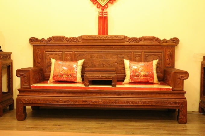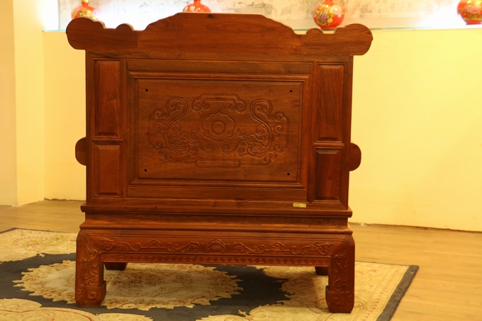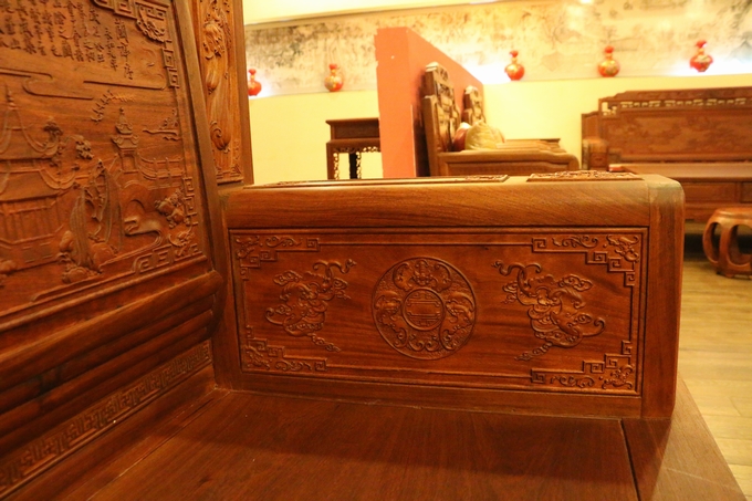 該款沙發(fā)整體之表現(xiàn)顯得極為嚴密厚實,無一處鏤空之雕飾,在最上端背板處的中間部分為留有一些花紋之邊幅加以修飾,顯得極為浮美雅觀。而在其左右兩側則另雕繪有“麒麟戲珠”與“雛鳥朝鳳”兩處紋飾圖案:“麒麟戲珠”紋飾設計地較為特別,如草龍紋一般,除頭部精細雕刻外,其余四肢與形體均簡略化,身體部位采用一銜邊條帶狀的紋飾相串于圓珠內(nèi),頗顯靈動神韻;而“雛鳥朝鳳”的圖案則是在背板最上部的左右兩端,末端是饒有一圓弧之設計為修飾收尾,顯得極為婉轉柔和圓潤。紋飾的圖案為一只可愛的雛鳥深情脈脈含情注視著前方鳥鳳的場景,顯得實為溫馨。鳳凰處之設計處理地也與前面麒麟一同:頭部細化,其余簡略帶過,鳳凰處眼眸之雕飾顯得極為醒目,神情表現(xiàn)形態(tài)逼真,層次感和手觸感亦十分明瀝彰顯,而經(jīng)燙蠟處理的表面緬花材質(zhì)表現(xiàn)地也更為細膩淡雅,極盡奢華。