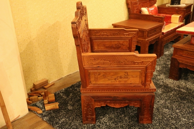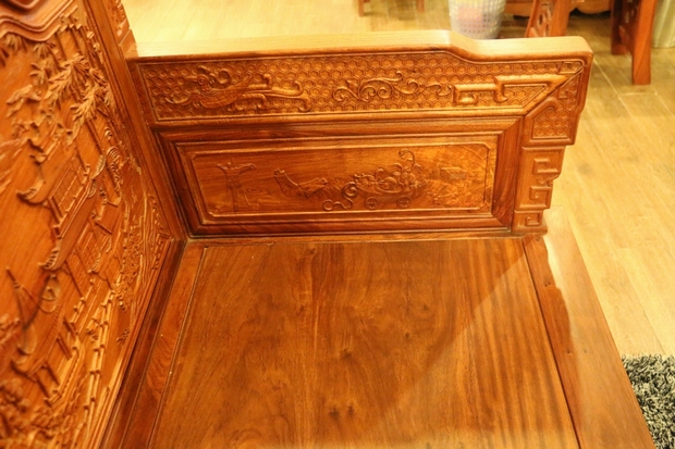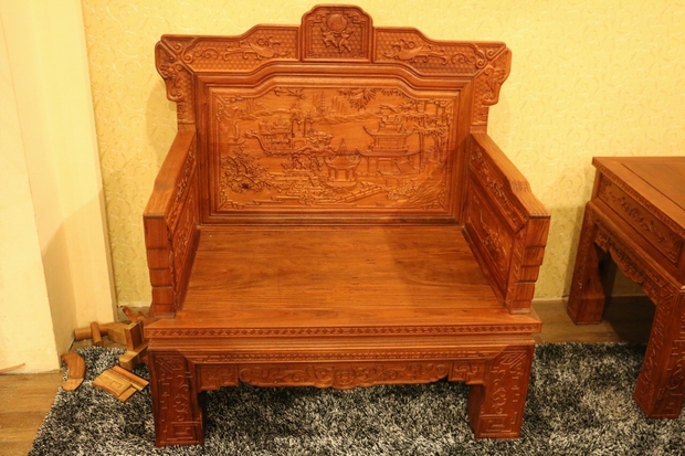 沙發(fā)的座椅面平整光滑,極盡原木材質(zhì)紋理之視覺感受;側(cè)面扶手處無任何鏤空面積之留飾,嚴實而框整,整體框架為矩形外觀設(shè)計。扶手上端正反兩面位置處,同樣雕繪有上處靠背板處鳳凰圖案形狀之紋飾,扶手底部正反兩面位置則雕繪有一些商周時期使用的器具,如斟酒器、編鐘等。