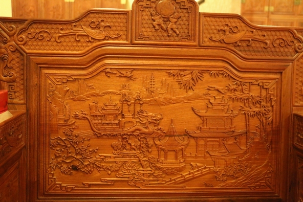 接下來,我們來看看沙發(fā)背靠板正面的主體部分,其畫案外部輪廓形狀呈現(xiàn)如一墨水瓶式形狀設(shè)計,上端較為扁實。內(nèi)部雕刻圖案展現(xiàn)得極為豐富艷麗,正如該款沙發(fā)名字所闡述的那樣——“漢宮春曉”,宛如一幅文人古畫卷中的景致,可以很清晰地看見:那波光漣漪的湖水載著亭臺綺立的龍舟,婉延而緩緩向前開來的景象,前段龍首處神情惟妙惟肖極為莊重而氣定神閑,畫案立于其主體的正中位置,顯得極為惹目和顯眼。在湖水岸邊,靠右端的湖岸上則是那茂密蔥郁的竹林,雖未能身處畫中,卻好似可以聽見,那一葉葉竹瓣隨著微風飄蕩,窸窣碎碎交相搖晃時所發(fā)出的聲響,頗顯幽靜而深遠。另在畫案后方的遠景處,除了稀疏而立的幾目草木郊野,還有一座頂天而豎的寶塔,遠遠眺望著,好似氣派風度。而在湖水的上方,還可以瞥見那兩只展翅高飛的仙鶴,它們乘風而列,自由翱翔時的自在景象,也為整體的畫卷添加了某種只有身處仙境神域時所能感受體會的到的意境神韻感受,另外仙鶴它也代表了長壽與富貴,它仙風道骨,為羽族之長,是為該幅富麗堂皇畫卷中的一處獨特景觀,妖嬈而鶴立。在整體圖案的其他位置,還雕繪有幾目莊嚴氣派矗于湖岸的亭臺樓倚,一尾身處龍舟后方悄悄而出的小帆舟,以及附著于畫卷中央下方位置處,飄縷浮動緩緩而延的祥云…