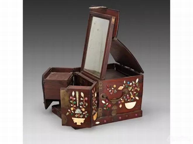 梳妝打扮是上至太后妃嬪,下至小家碧玉都喜愛的一種本能。而作為皇室,太后、妃嬪們所用的器物又更高端的多。北齊的胡太后,讓沙門靈昭,制造了七寶鏡臺,三十六個門戶各有一婦人,手中各自拿著鎖匙,只要輕碰其中一個門戶,這三十六戶一時全都自行關閉;若抽出其中一關的鎖匙,那么其余諸門,盡皆開啟,婦人都出現戶前站立。唐朝的馬登封也曾為皇后制妝臺,進退、開合全自動,都不須人力,巾櫛(梳篦的總稱)、香粉,依次遞送、循序進獻??匆姷娜?,都認為是鬼斧神工。
