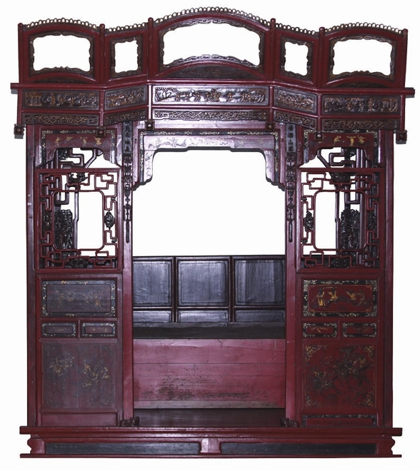 床為月洞式開門,由11塊獨立雕花板拼成。上部7塊雕花板中心開光雕刻拜謁、訪友、慶